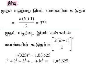 2. 1 + 2 + 3 + ... + k = 325, எனில் 13 + 23 + 33 + ... + k3 யின் மதிப்பு காண்க.