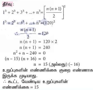 4. 13 + 23 + 33 + … என்ற தொடரின் எத்தனை உறுப்புகளைக் கூட்டினால் கூடுதல் 14400 கிடைக்கும்?