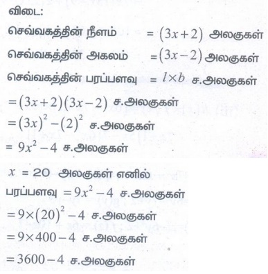 11. ஒரு செவ்வகத்தின் நீளம் (3x+2) அலகுகள் மற்றும் அதன் அகலம் (3x−2) அலகுகள் எனில் x ஐப் பொருத்து அதன் பரப்பளவைக் காண்க. x = 20 எனில், அதன் பரப்பளவைக் காண்க.