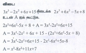 7. 2x3 + 6x2 – 5x + 8 உடன் எந்தப் பல்லுறுப்புக் கோவையைக் கூட்ட 3x3 – 2x2 + 6x + 15 கிடைக்கும்?