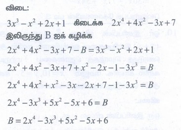 8. 2x4 + 4x2 – 3x + 7 இலிருந்து எந்தப் பல்லுறுப்புக் கோவையைக் கழிக்க 3x3 – x2 + 2x + 1 கிடைக்கும்?