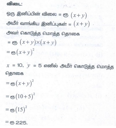 10. ஒர் இனிப்பின் விலை ₹(x + y). அமீர் (x + y) இனிப்புகளை வாங்கினார். எனில் அவர் கொடுத்த மொத்தத் தொகையை x மற்றும் y களில் காண்க. மேலும் x =10, y =5 எனில் அமீர் கொடுத்த தொகை எவ்வளவு?