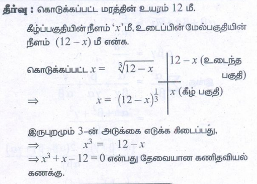 11. 12 மீட்டர் உயரமுள்ள ஒரு மரம் இரு பகுதிகளாக முறிந்துள்ளது. முறிந்த இடம் வரை இருக்கும் கீழ்ப்பகுதி, உடைப்பின் மேற்பகுதியின் நீளத்தின் கனமூலம் ஆகும். இந்தத் தகவலை கீழ்ப்பகுதியின் நீளம் காணும் வகையில் கணிதவியல் கணக்காக மாற்றுக.