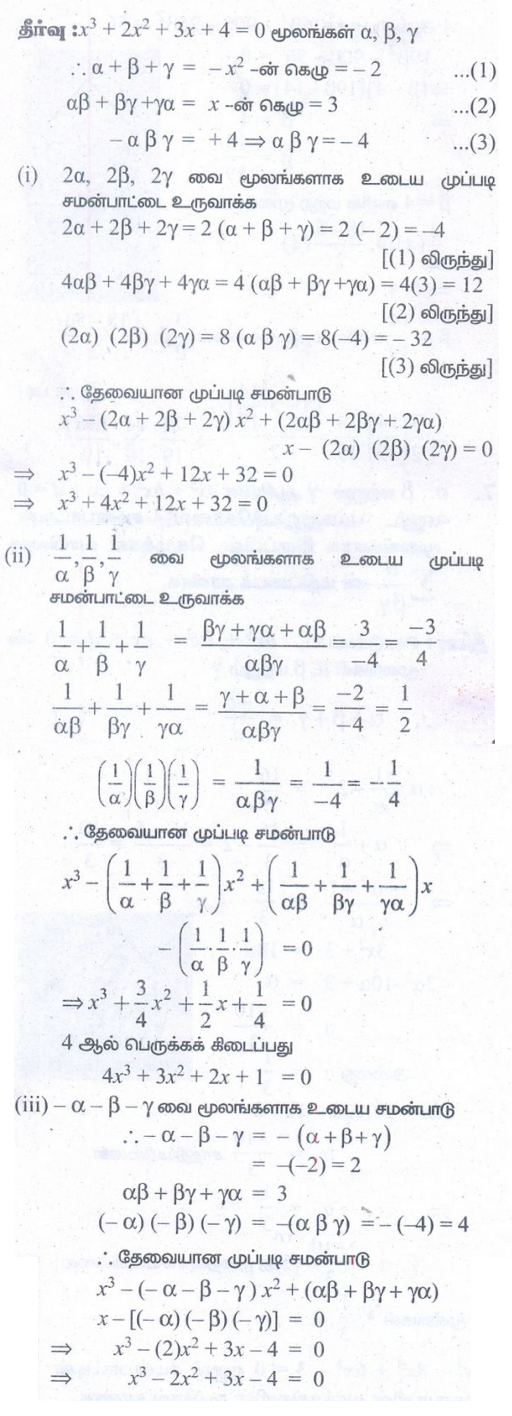 3. x3+ 2x2 + 3x + 4 = 0 எனும் முப்படி சமன்பாட்டின் மூலங்கள் α, β, மற்றும் γ எனில் கீழ்க்காணும் மூலங்களைக் கொண்டு முப்படி சமன்பாடுகளை உருவாக்குக.