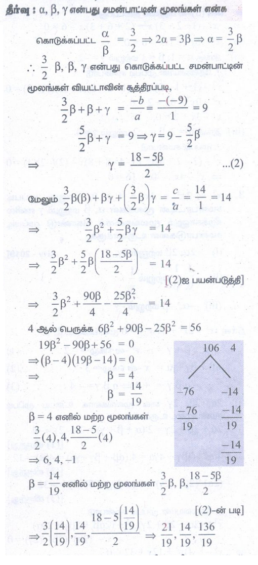 6. x3 − 9x2 + 14x + 24 = 0 எனும் சமன்பாட்டின் இரு மூலங்கள் 3 : 2 என்ற விகிதத்தில் அமைந்தால், சமன்பாட்டை தீர்க்க.