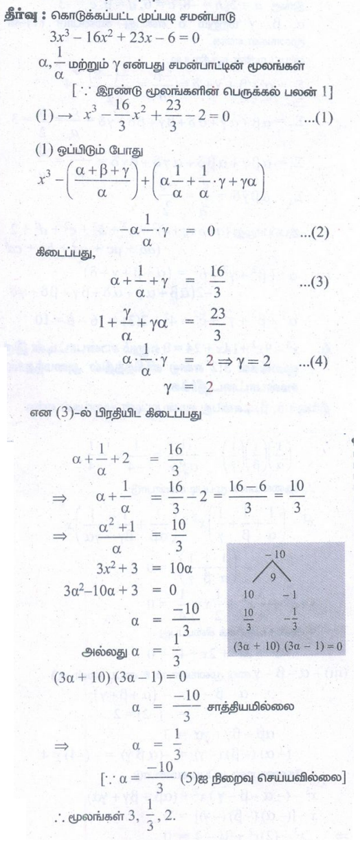 4. 3x3 −16x2 + 23x – 6 = 0 எனும் சமன்பாட்டின் இரு மூலங்களின் பெருக்கல் 1 எனில் சமன்பாட்டினைத் தீர்க்க.