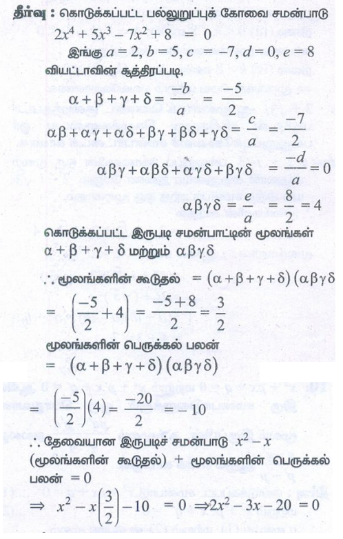 8. α, β, γ மற்றும் δ ஆகியன 2x4 + 5x3 − 7x2 + 8 = 0 எனும் பல்லுறுப்புக்கோவை சமன்பாட்டின் மூலங்கள் எனில், α + β + γ + δ மற்றும் αβγδ ஆகியவற்றினை மூலங்களாகவும் முழு எண்களை கெழுக்களாகவும் கொண்ட ஓர் இருபடி சமன்பாட்டைக் காண்க.