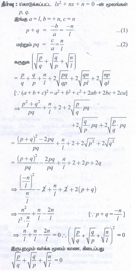 9. lx2 + nx + n = 0 எனும் சமன்பாட்டின் மூலங்கள் p மற்றும் q எனில், √(p/q) + √(q/p) + √(n/l) = 0 எனக் காட்டுக.