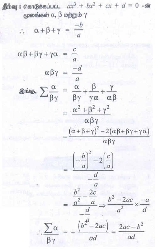 7. α, β மற்றும் γ ஆகியன ax3 + bx2 + cx + d = 0 எனும் பல்லுறுப்புக்கோவை சமன்பாட்டின் மூலங்களாக இருப்பின், கெழுக்கள் வாயிலாக ∑α/(βγ) ன் மதிப்பைக் காண்க.