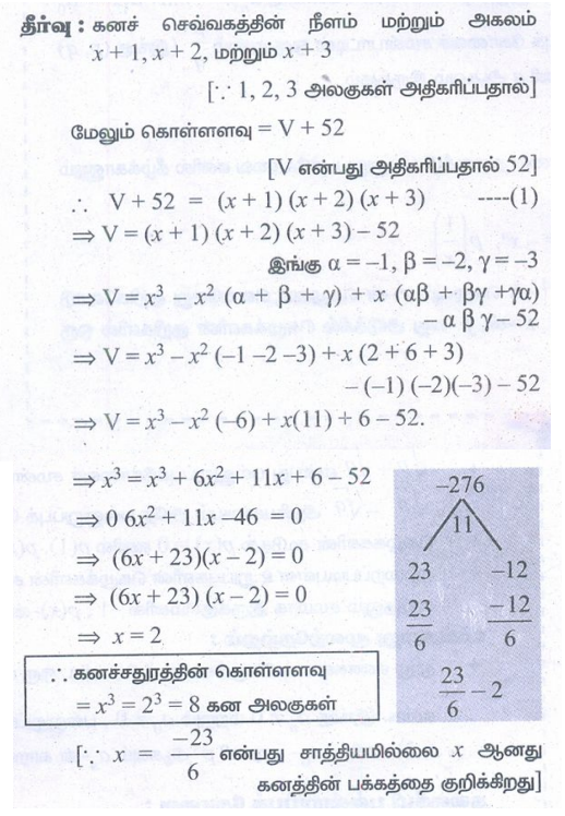 1. ஒரு கனச் சதுரப் பெட்டியின் பக்கங்களை 1, 2, 3 அலகுகள் அதிகரிப்பதால் கனச்சதுரப் பெட்டியின் கொள்ளளவைவிட 52 கன அலகுகள் அதிகமுள்ள கனச் செவ்வகம் கிடைக்கிறது எனில், கன செவ்கத்தின் கொள்ளளவைக் காண்க.