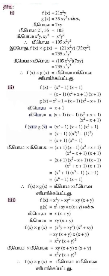 1. பின்வருவனவற்றில் முறையே f (x) மற்றும் g (x) ஆகியவற்றின் மீ.பொ.வ மற்றும் மீ.பொ.ம காண்க. மேலும், f (x) × g (x) = (மீ.பொ.ம) × (மீ.பொ.வ) என்பதைச் சரிபார்க்க.