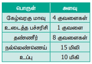 (ஆ) 16 குவளைகள் தண்ணீரைப் பயன்படுத்தினால் எத்தனைக் குவளைகள் கேழ்வரகு மாவு பயன்படுத்தப்பட வேண்டும்?