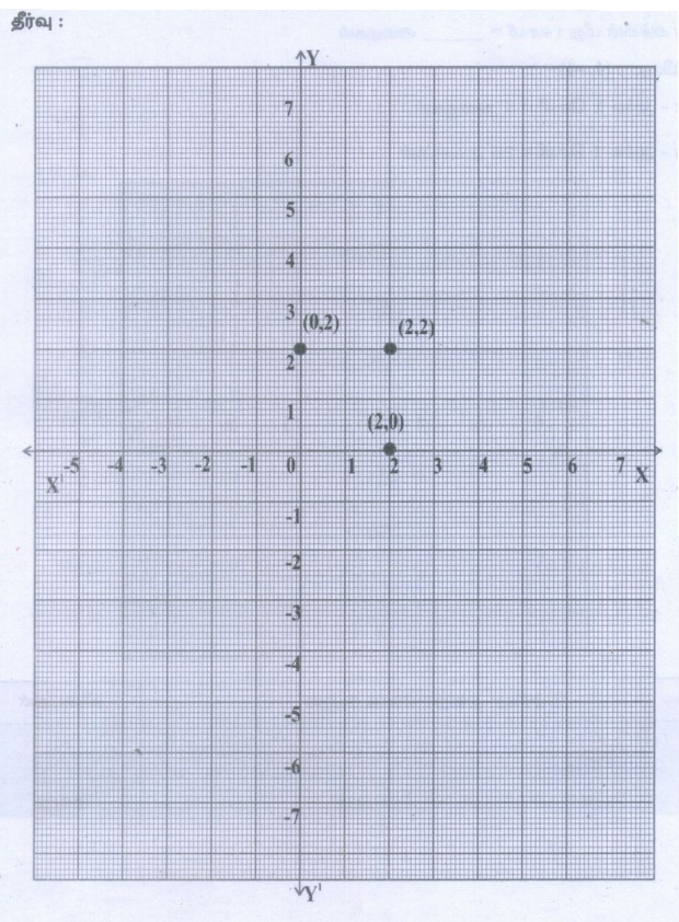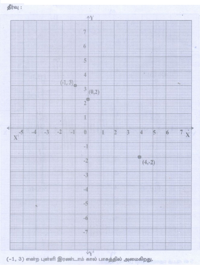4. (4,–2) என்ற புள்ளி வழியாகச் செல்லும் கோடு Y அச்சை (0,2) என்ற புள்ளியில் சந்திக்கிறது. இந்த கோட்டின் மீது இரண்டாம் கால்பகுதியில் அமையும் புள்ளி ஏதேனும் ஒன்றைக் கூறுக.