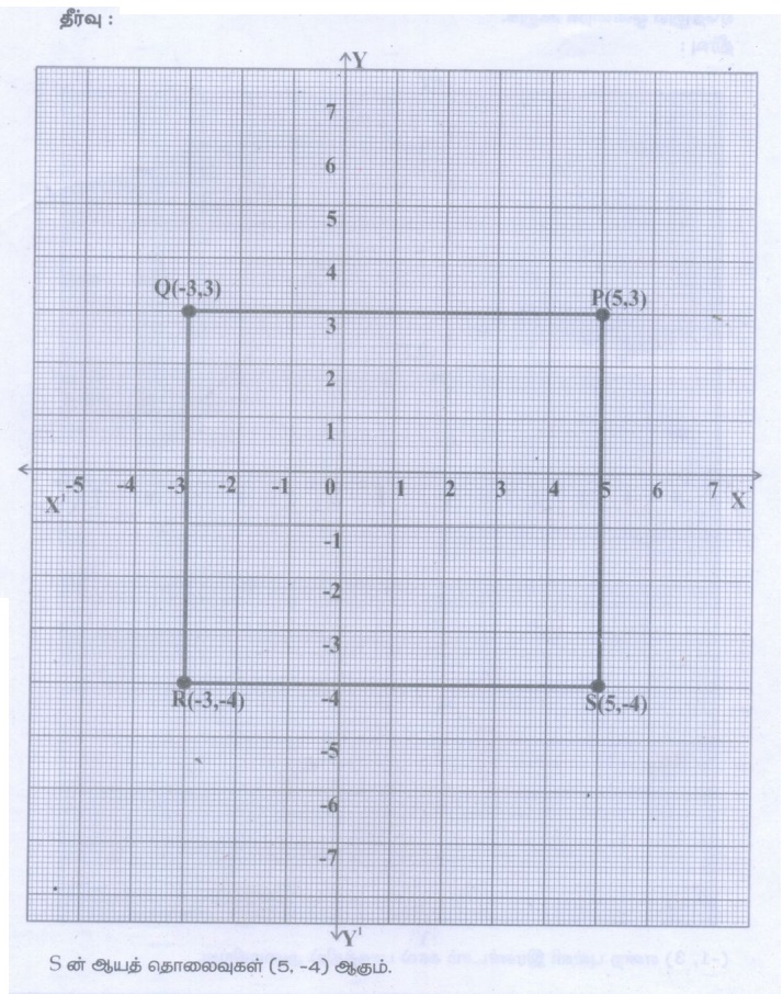 5. P (5,3) Q(–3,3) R(–3,–4) மற்றும் S ஆகிய புள்ளிகள் ஒரு செவ்வகத்தை உருவாக்கும் எனில் புள்ளி S இன் ஆயத் தொலைவுகளைக் காண்க.