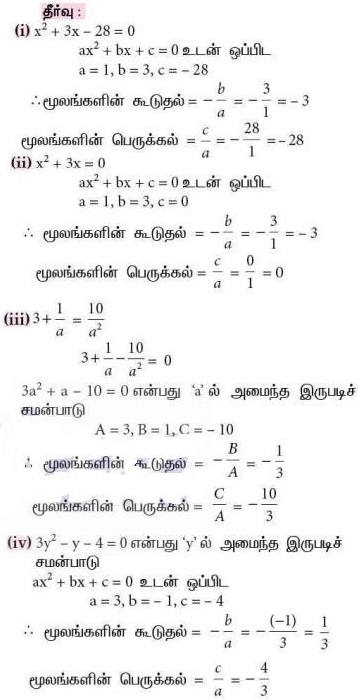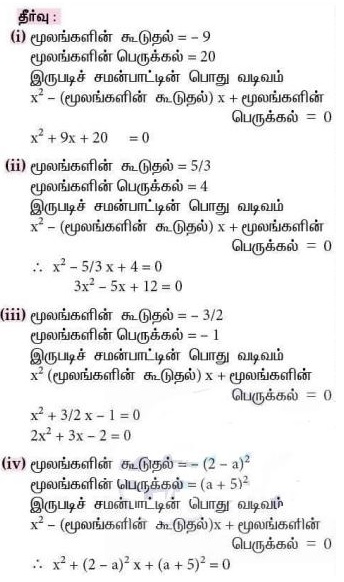 கணக்கு புத்தக பயிற்சி கேள்விகளுக்கான பதில்கள் மற்றும் தீர்வு - கணிதம்: இயற்கணிதம் : இருபடிச் சமன்பாடுகள் : பதில், தீர்வுடன் பயிற்சி வினாக்கள்