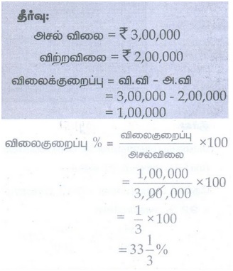 5. ₹300000 மதிப்புள்ள ஒரு மகிழுந்தை ₹200000 இக்கு விற்றால், அந்த மகிழுந்தின் விலைக்குறைப்புச் சதவீதத்தைக் காண்க.