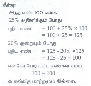 9. ஓர் எண்ணானது 25% அதிகரிக்கப்பட்டுப் பிறகு 20% குறைக்கப்படுகிறது எனில், அந்த எண்ணில் ஏற்பட்ட சதவீத மாற்றத்தைக் காண்க.
