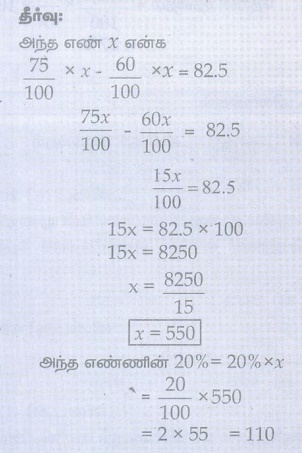 6. ஓர் எண்ணின் 75% இக்கும் அதே எண்ணின் 60% இக்கும் இடையேயுள்ள வித்தியாசம் 82.5 எனில், அந்த எண்ணின் 20% ஐக் காண்க.
