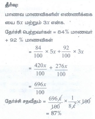 10. ஒரு வகுப்பிலுள்ள மாணவர்கள் மற்றும் மாணவிகளின் விகிதம் 5:3 ஆகும். ஒரு தேர்வில் 16% மாணவர்களும் 8% மாணவிகளும் தேர்ச்சி பெறவில்லை எனில், தேர்ச்சி பெற்ற மாணவ−மாணவிகளின் சதவீதத்தைக் காண்க.