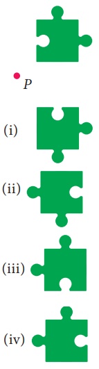 19. புதிர் படத்தினை நிறைவுசெய்ய அதன் ஒரு பகுதியை P என்ற புள்ளியைப் பொருத்து 270° அளவுக்குக் கடிகாரச் சுற்றின் திசையில் சுழற்ற வேண்டும். கொடுக்கப்பட்டுள்ள துண்டுகளில் எந்தத் துண்டு பொருத்தமானது?