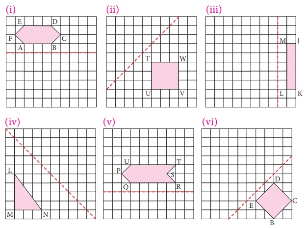 5. பின்வரும் படம் ஒவ்வொன்றிலுமுள்ள வடிவத்தைக் கொடுக்கப்பட்ட எதிரொளிப்புக் கோட்டைப் பொருத்து எதிரொளிப்புச் செய்க.