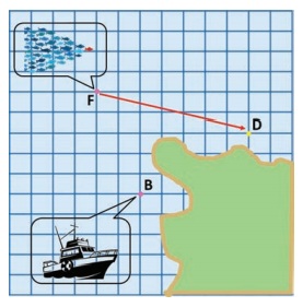 10. ஒரு மீன் கூட்டம் F என்ற புள்ளியிலிருந்து D என்ற புள்ளிக்கு இடப்பெயர்ப்பு அடைகிறது எனில்,