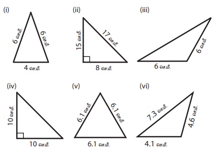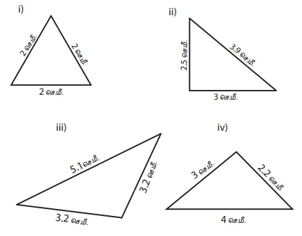 4. பக்கங்களின் அடிப்படையில் கொடுக்கப்பட்ட முக்கோணங்களை அசமபக்க அல்லது இருசமபக்க அல்லது சமபக்க முக்கோணம் என வகைப்படுத்துக.