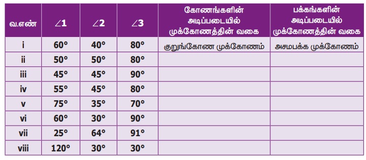 11. கொடுக்கப்பட்டுள்ள தகவல்களைக் கொண்டு முக்கோணத்தின் வகையைப் பின்வரும் அட்டவணையில் எழுதுக.