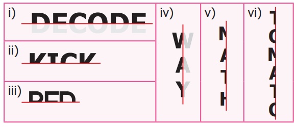 5. கொடுக்கப்பட்டுள்ள குத்துக்கோடு/கிடைமட்டக்கோட்டினை சமச்சீர்க்கோடாகக் கொண்டு, ஒவ்வோர் எழுத்தையும் முழுமை செய்து மறைந்துள்ள சொற்களைக் கண்டுபிடிக்க.