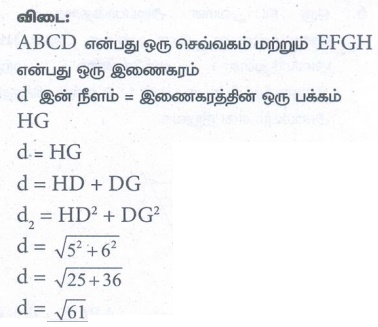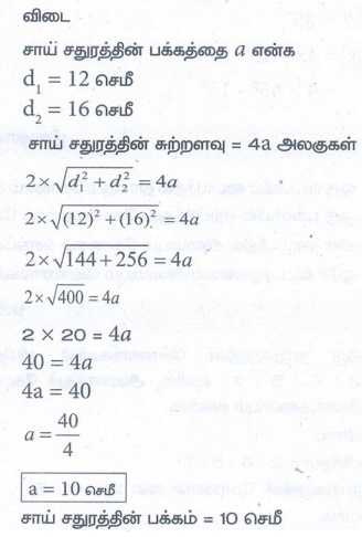 மூலை விட்டங்களின் நீளங்கள் 12 செ.மீ. மற்றும் 16 செ.மீ. எனில், சாய்சதுரத்தின் பக்க அளவு காண்க.