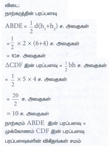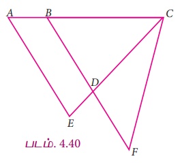 AB = 2, BC = 6, AE = 6, BF = 8, CE = 7 மற்றும் CF = 7, எனில், நாற்கரம் ABDE இன் பரப்பு மற்றும் ∆CDF இன் பரப்பிற்கும் உள்ள விகிதம் காண்க. (சர்வ சம முக்கோணத்தின் பண்பைப் பயன்படுத்துக)