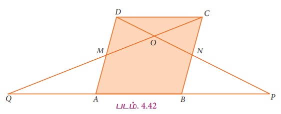 இணைகரம் ABCD இல் முனை D இலிருந்து வரையப்படும் கோடு DP ஆனது BC இன் நடுப்புள்ளியை N இலும், AB இன் நீட்சியை P இலும் சந்திக்கிறது. C இலிருந்து வரையப்படும் கோடு CQ ஆனது, AD இன் நடுப்புள்ளியை M இலும், AB இன் நீட்சியை Q விலும் சந்திக்கிறது. கோடுகள் DP மற்றும் CQ ஆனது O இல் சந்திக்கின்றன, எனில் ∆QPO இன் பரப்பளவானது, இணைகரம் ABCD இன் பரப்பளவில் 9/8 மடங்கு என நிறுவுக.