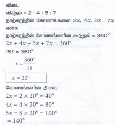 நாற்கரத்தின் கோணங்களின் விகிதம் 2:4:5:7 எனில், அனைத்துக் கோண அளவுகளையும் காண்க.