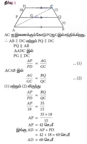 2. ABCD என்ற ஒரு சரிவகத்தில் AB || DC மற்றும் P, Q என்பன முறையே பக்கங்கள் AD மற்றும் BC-யின் மீது அமைந்துள்ள புள்ளிகள் ஆகும். மேலும் PQ || DC, PD = 18 செ.மீ, BQ = 35 செ.மீ மற்றும் QC = 15 செ.மீ எனில், A D காண்க.