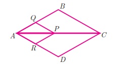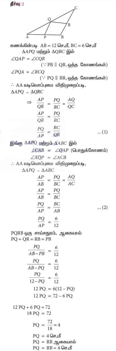 5. ΔABC - யின் உள்ளே ∠B ஐ ஒரு கோணமாகக் கொண்ட சாய்சதுரம் PQRB அமைந்துள்ளது. P, Q மற்றும் R என்பன முறையே பக்கங்கள் AB, AC மற்றும் BC மீது அமைந்துள்ள புள்ளிகள் ஆகும். A B =12 செ.மீ மற்றும் BC = 6 செ.மீ எனில், சாய்சதுரத்தின் பக்கங்கள் PQ, RB - யைக் காண்க.
