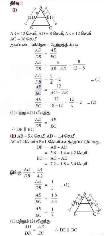 1. ΔABC யின் பக்கங்கள் AB மற்றும் AC -யின் மீதுள்ள புள்ளிகள் முறையே D மற்றும் E ஆனது DE || BC என்றவாறு அமைந்துள்ளது. (i) AD/DB = 3/4 மற்றும் AC =15 செ.மீ எனில் AE -யின் மதிப்பு காண்க.