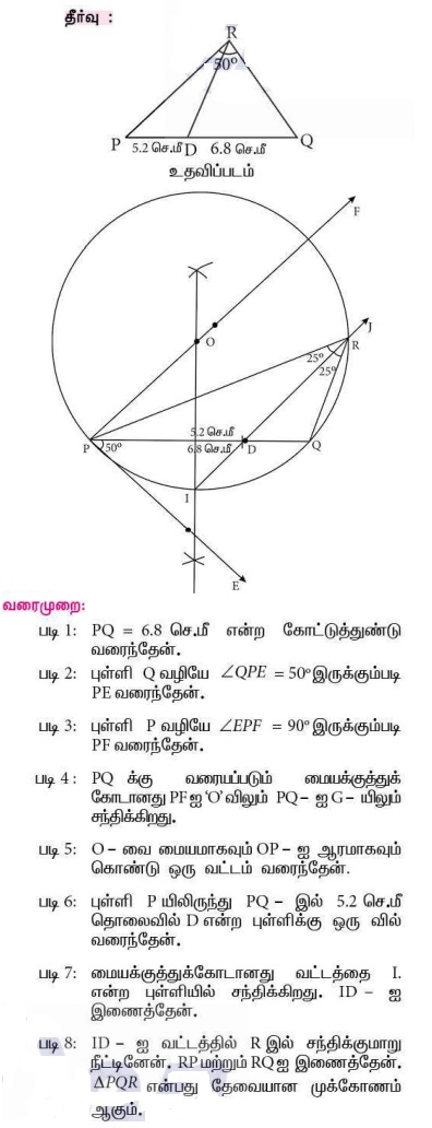 16. PQ = 6.8 செ.மீ, உச்சிக்கோணம் 50° மற்றும் உச்சிக்கோணத்தின் இருசமவெட்டியானது அடிப்பக்கத்தை PD = 5.2 செ.மீ என D-யில் சந்திக்குமாறு அமையும் ΔPQR வரைக.