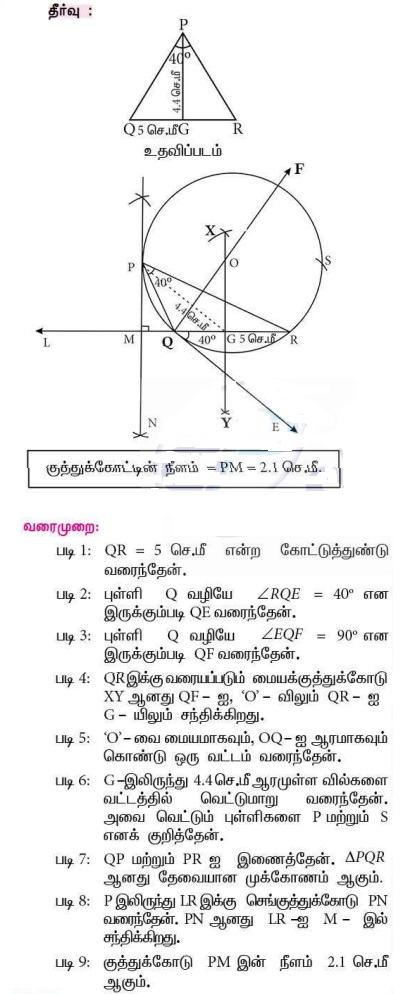 12. QR = 5 செ.மீ, ∠P = 40° மற்றும் உச்சி P-யிலிருந்து QR-க்கு வரையப்பட்ட நடுக்கோட்டின் நீளம் PG = 4.4 செ.மீ என இருக்கும்படி ΔPQR வரைக. மேலும் P-லிருந்து QR-க்கு வரையப்பட்ட குத்துக்கோட்டின் நீளம் காண்க.