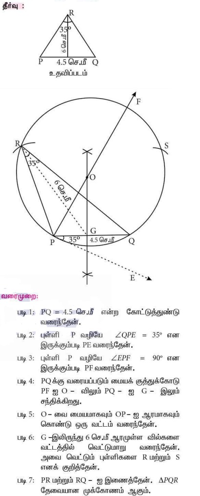 11. PQ = 4.5 செ.மீ, ∠R = 35° மற்றும் உச்சி R-யிலிருந்து வரையப்பட்ட நடுக்கோட்டின் நீளம் RG = 6 செ.மீ என அமையுமாறு ΔPQR வரைக.