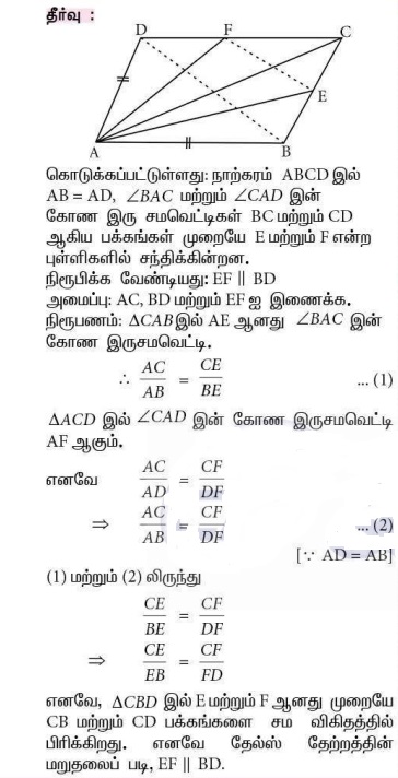 10. நாற்கரம் ABCD-யில் AB=AD, ∠BAC மற்றும் ∠CAD-யின் கோண இருசமவெட்டிகள் BC மற்றும் CD ஆகிய பக்கங்களை முறையே E மற்றும் F என்ற புள்ளிகளில் சந்திக்கின்றன எனில், EF || BD என நிறுவுக.