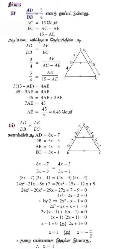 (ii) AD = 8x - 7, DB = 5 x - 3, AE = 4x - 3 மற்றும் EC = 3 x - 1 எனில், x- ன் மதிப்பு காண்க.