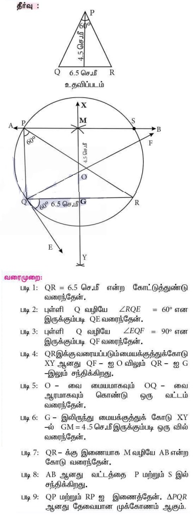 13. QR = 6.5 செ.மீ, ∠P = 60° மற்றும் உச்சி P-யிலிருந்து QR-க்கு வரையப்பட்ட குத்துக் கோட்டின் நீளம் 4.5 செ.மீ உடைய ΔPQR வரைக.