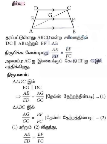 6. சரிவகம் ABCD-யில் AB || DC, E மற்றும் F என்பன முறையே இணையற்ற பக்கங்கள் AD மற்றும் BC -ன் மீது அமைந்துள்ள புள்ளிகள், மேலும் EF || AB என அமைந்தால் என நிறுவுக.