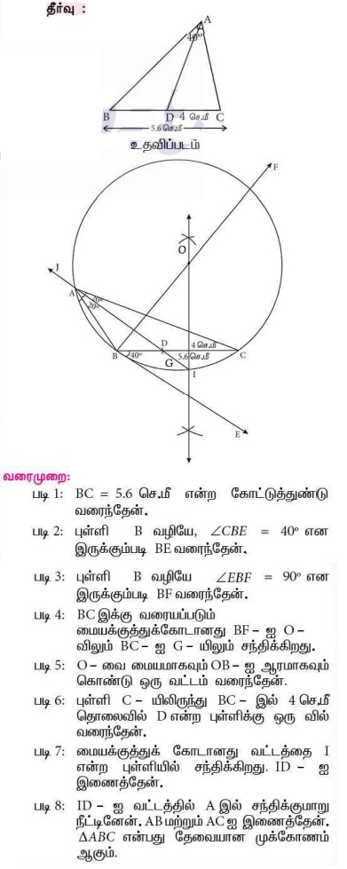 15. அடிப்பக்கம் BC = 5.6 செ.மீ, ∠A = 40° மற்றும் ∠A -யின் இருசமவெட்டியானது அடிப்பக்கம் BC-ஐ CD = 4 செ.மீ என D-யில் சந்திக்குமாறு அமையும் முக்கோணம் ABC வரைக.