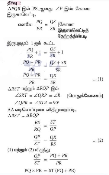 9. படத்தில் ∠QPR = 90°, PS ஆனது ∠P -யின் இருசமவெட்டி மேலும், ST ┴ PR எனில், ST × (PQ + PR) = PQ × PR.என நிறுவுக.