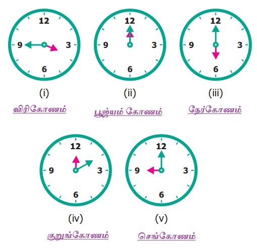 9. கொடுக்கப்பட்டுள்ள படங்களில், கடிகாரத்தின் முட்கள் காட்டும் கோணங்களின் வகைகளைக் கண்டறிக.