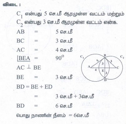 மற்றும் 3 செமீ ஆரமுள்ள இரு வட்டங்கள், இரண்டு புள்ளிகளில் வெட்டிக் கொள்கின்றன. மேலும், அவற்றின் மையங்களுக்கு இடைப்பட்ட தொலைவு 4 செமீ எனில், பொது நாணின் நீளத்தைக் காண்க.