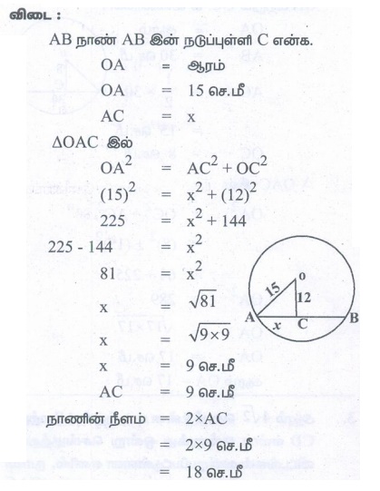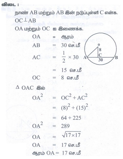 மையத்திலிருந்து 8 செமீ தொலைவில் 30 செமீ நீளமுள்ள நாண் வரையப்பட்டுள்ளது எனில், வட்டத்தின் ஆரம் காண்க.