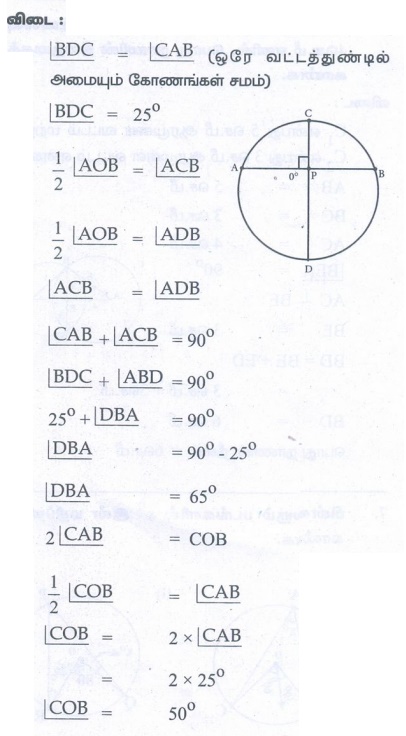 8. கொடுக்கப்பட்டுள்ள படத்தில், ∠CAB = 25° எனில், ∠BDC , ∠DBA மற்றும் ∠ COB காண்க.