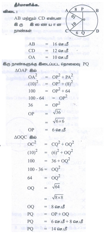 விட்டம் 52 செமீ மற்றும் ஒரு நாணின் நீளம் 20 செமீ எனில், மையத்திலிருந்து நாணிற்கு உள்ள தூரம் காண்க.